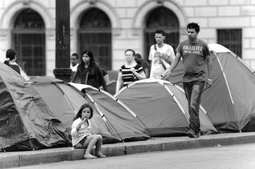 セントロの橋の上にいろとりどりの真新しいテントが突如出現した。 「家賃を払えない。住む場所を!」という抗議運動である。 169のテントの中には、女、子供、老人がいるせいか、 ほとんど 歩くこともできない程、歩道を塞いでいるにもかかわらず、警察は見ているだけである。 無理に撤去して暴力沙汰にでもなったら、新聞、テレビに一斉に叩かれるからだろう? クリスマスイブに、忽然とテント群が消えた。 政治家の臭いがプンプンする。 貧しい人々や子供達を政治に利用するな!