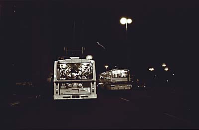 深夜、トローリーバスに乗っていると、このままずっとまったく知らない土地まで連れていかれるような気分になる。降りたいのだけど降りられない、バスと一緒に闇の中に吸い込まれるよう不安な感覚。 疲れきった表情をした乗客達は、一人また一人と降りていき、降りた瞬間、生気を取り戻す。 バスが角を曲がり、いつものポント(停留所)が見えた時、寝ている彼女の顔が浮かんだ。