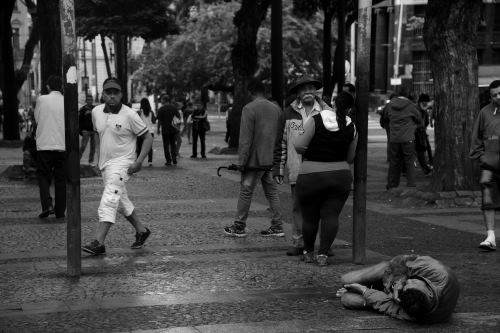 昔からこの広場は、サンパウロの吹きだまりであった 時代、時代によってわずかに変わったものの、集まって来る人は同じような人が多い 倒れ込むように地面で寝ている人、男を誘う年配の娼婦、毛布に包まって行きかう人をじっと見ている男、犯罪人・・・ 居る人は、社会からはじきとばされた最下級の人々ばかり 住む所がないことも、お金がないことも、なんの恥ずかしさもない。なぜなら、ここに集まる人のほとんどはそうであるから