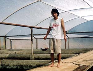 さあこれから、いよいよと言う段階になり、このページも一時止まったのかと言う不安を抱かれてしまいましたが、これは、ブラジル国内の法律やワシントン条約などの色々な問題が重なり合い、我々の実験が公式に文章として発表出来ないでいた事が原因であり、実験そのものの中止、停滞とは無関係であり、それどころか、気の早い日本の青年が大学を卒業して、アルバイトして、アマゾンの魚、特にピラルクに興味がある。是非、養殖場を見せて研修させて下さいと、言わんばかりに、我が家の門を叩いたのは、6月29日だった。それ以後、現在に至るまで無償で働き研修している。ビザの関係上3ヶ月しか居られないのを10月3日の測定もやらせてくれと意気込んでいる。その後、彼は、野生のピラルクを見る為にアマゾンへの無銭旅行に旅立ち、日本帰国は何時になるか。みごとアマゾンのワニ、野獣の餌食になるか?誰にも判らないが、予定は来年4月から6月頃には帰国したいとのこと。(青年こと、二葉 春樹さん連絡先 〒340-0022 埼玉県草加市瀬崎町 626-303 TEL:0489-29-4805)
