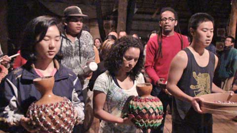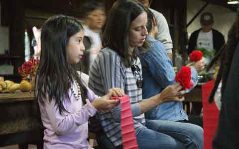 厳かな雰囲気の中、入場の儀式の所作を習う |