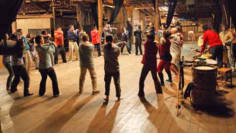 ワークショップではブラジルやアフリカ系の打楽器を主とした生演奏で行われる。 |